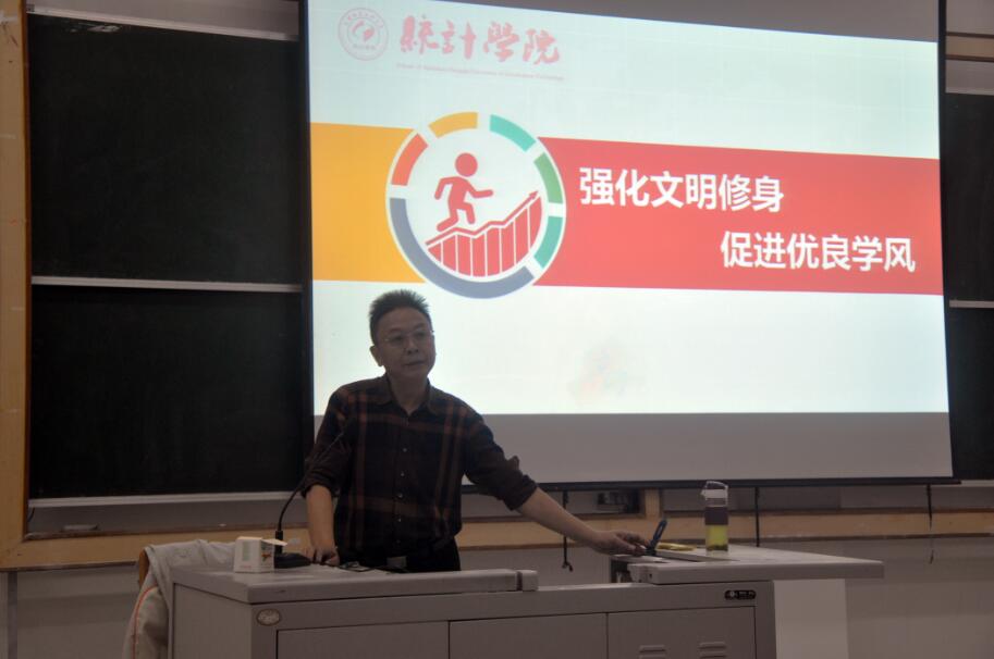 【本网讯】为切实落实成信学工部发〔2016〕12号《关于开展“强化文明修身,促进优良学风”主题活动的通知》文件精神,开展好“强化文明修身,促进优良学风”主题活动,10月24日、26日,统计学院在L3102教室面向全院本科学生举行了“强化文明修身,促进优良学风”活动动员会。动员会由统计学院党总支书记孙克常主持。