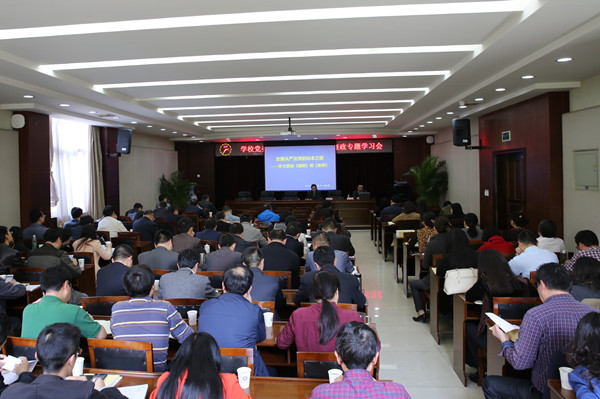 [本网讯]4月14日下午,学校在行政楼第一会议室召开党委中心(扩大)组党风廉政专题学习会。会议特邀省委党校党史党建教研部主任王凡教授就学习贯彻《中国共产党廉洁自律准则》和《中国共产党纪律处分条例》(以下简称《准则》和《条例》)进行专题辅导。全体处级以上领导干部参加了会议,会议由学校党委副书记敬枫蓉主持。