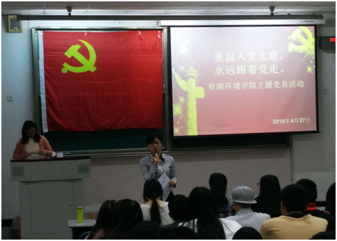 为认真贯彻执行中央、省委、省委教育工委关于在全体党员中开展“两学一做”相关文件精神和响应校党委《关于在全校党员中开展“学党章党规、学系列讲话,做合格党员”学习教育的实施方案》要求,4月27日,资源环境学院学生党支部开展“重温入党志愿,永远跟着党走”主题党日活动。本次活动由全体党员参加,学生党支部书记王燕老师全程参加并指导。