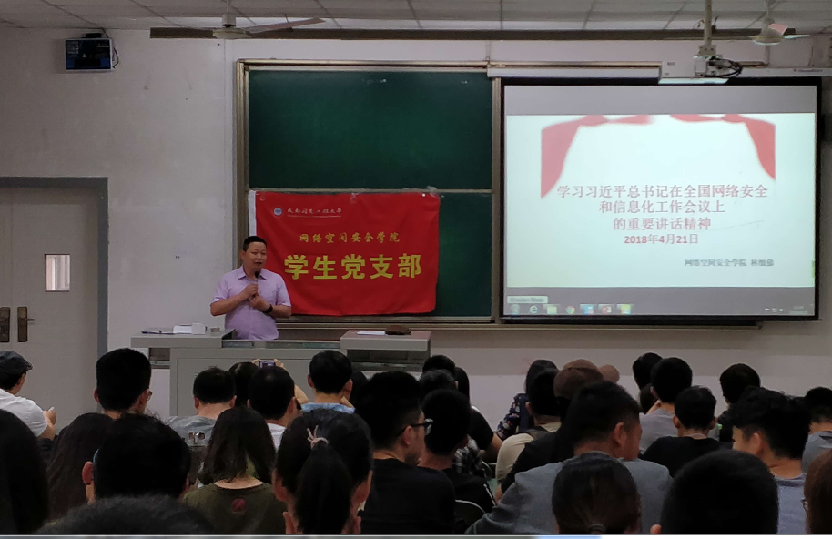 4月28日中午,网络空间安全学院党总支副书记林细俤带领全体学生党员和部分入党积极分子在2102教室观看了习近平总书记在全国网络安全和信息化工作会议上的重要讲话视频。林细俤从网络强国思想的形成、正确网络安全观、核心技术是国之重器、加快信息化发展、加强党中央对网信工作的集中统一领导、推进全球互联网治理体系变革大势所趋六大方面对会议精神做了解释和阐述。他提到网络空间安全学院的成立就是在中央精神的指引下,在学校主要领导的高度重视和积极推动下应时而生、顺势而为的。党的十八大以来,中央高度重视网络安全和信息化工作,成立了网络安全和信息化领导小组,习近平总书记亲自担任组长,并就网络安全和信息化工作多次发表重要讲话。今年党中央首次召开了全国网络安全与信息化工作会议,对当前和今后一个时期网信工作作出重要战略部署。全院师生要把几次会议的精神连贯起来学习贯彻,指导今后的学习科研工作。他强调,“身为网络空间安全学院的党员同学,应该努力学习网络空间安全专业知识,为网络强国建设、实现中华民族伟大复兴的中国梦做出应有的贡献。”