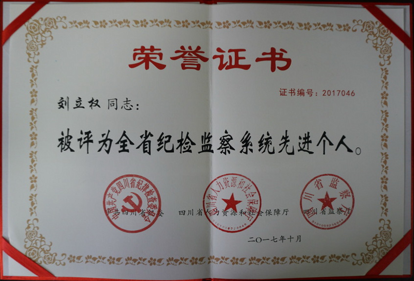 2017年10月13日,四川省纪检监察系统表彰大会在成都金牛宾馆召开。我校纪委副书记、纪委办公室(监察处)主任(处长)刘立权同志作为省属高校唯一获奖者,荣获“全省纪检监察系统先进个人”荣誉称号。