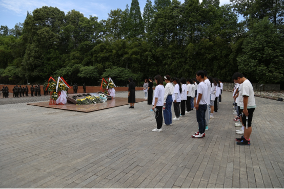 在中国壮士群雕广场,出现在眼前的是栩栩如生的200多名抗日英雄的群体形象,每位英雄的相貌、身材、站姿、神态、甚至衣物配饰都不一样。真实地还原了抗日将士们的音容笑貌。同学们自觉地走向前低头默哀致敬,表达了对烈士们的深切哀悼。