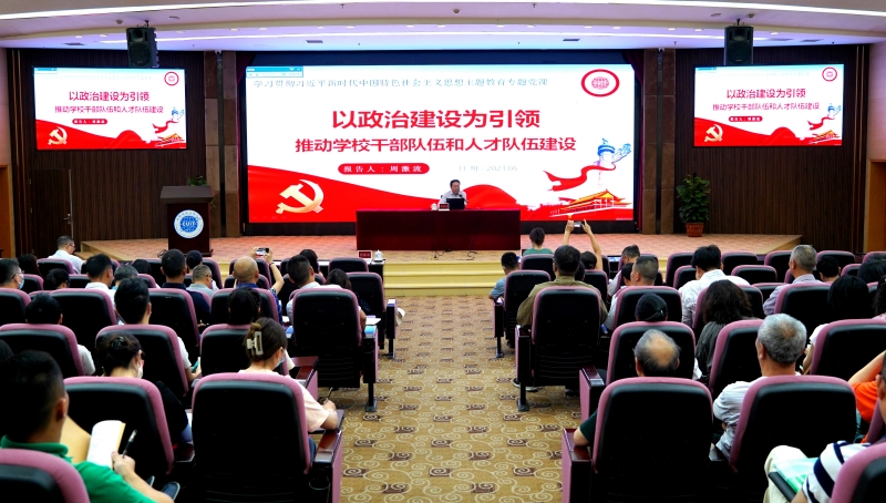 周激流围绕习近平新时代中国特色社会主义思想的丰富内涵,主题教育的总要求和根本任务,结合推进学校高质量发展的工作实际,与大家深入交流了学习习近平新时代中国特色社会主义思想的认识和体会。他从党的政治建设是党的根本性建设;加强党的政治建设,关键是提高各级各类党组织和党员干部政治能力;以政治建设引领我校的干部队伍;以政治建设引领我校的师资队伍建设四方面展开讲授。